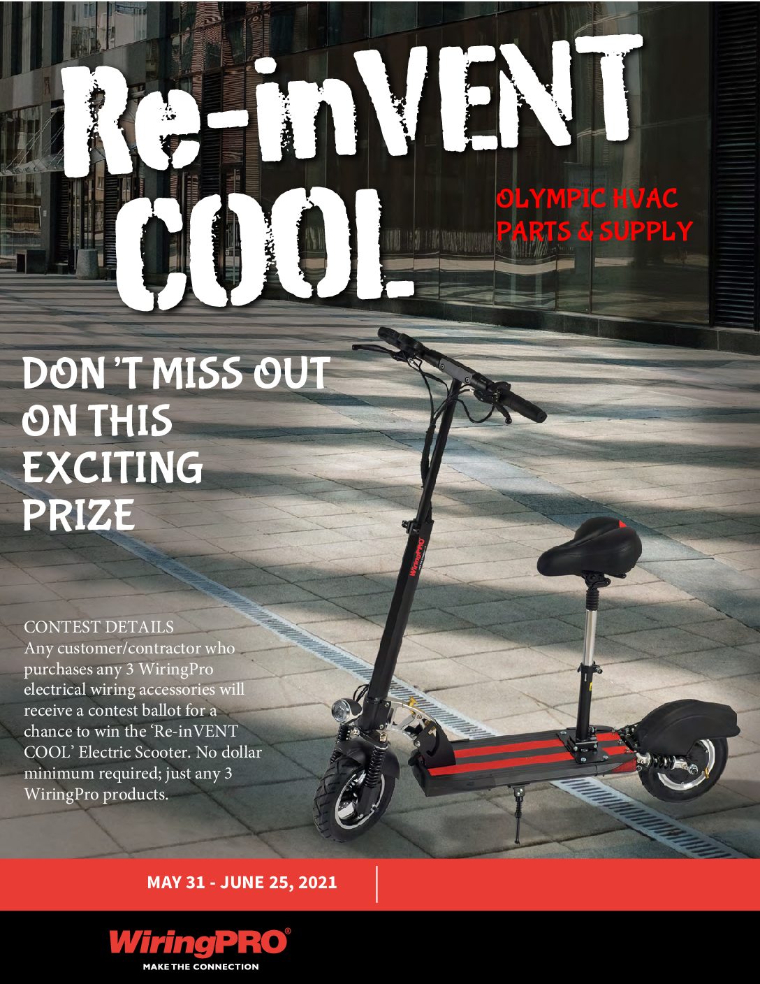 Any Olympic International HVAC Parts customer/contractor who purchases any 3 WiringPro electrical wiring accessories will receive a contest ballot for a chance to win the ‘Re-inVENT COOL’ Electric Scooter. No dollar minimum required; just any 3 WiringPro products. The contest runs from May 31 through June 25th, 2021.