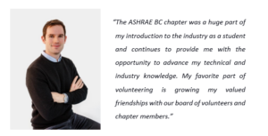 We would like to acknowledge Nick McWhirter, Engineering Salesperson at Olympic International, who has done an outstanding job contributing to and advancing the industry. Nick first joined the ASHRAE BCIT student chapter and has continued volunteering for 6 years since graduation. Now, he has been elected President for 2023-2024.